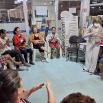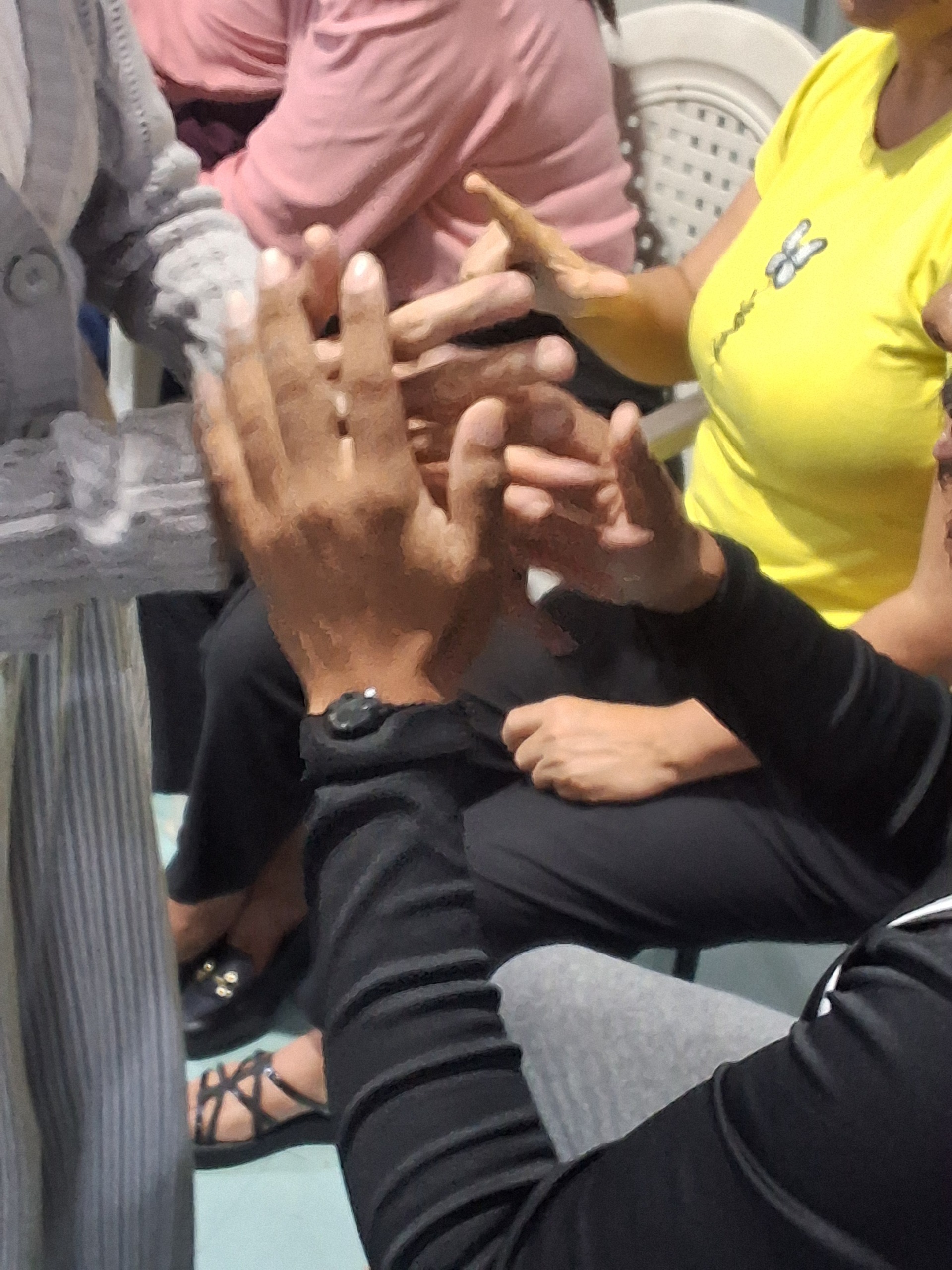 Durante a oficina, os participantes aprenderam a se comunicar utilizando as mãos como principal canal, vivenciando na prática uma nova forma de linguagem. Foram trabalhadas noções básicas da Libras tátil, com orientações sobre o posicionamento correto das mãos, além da percepção dos sinais a partir do contato direto, a oficina foi ministrada pela Professora Adriana Castro e Dona Estelita.