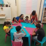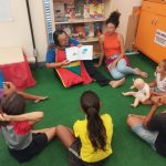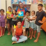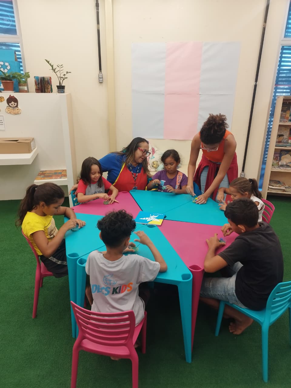 Após a leitura, os participantes foram convidados a refletir sobre as cores e seus significados por meio de uma dinâmica prática: a mistura do azul com o amarelo, que resulta no verde. A proposta dialogou diretamente com a temática do livro e fez referência ao verde da bandeira do Brasil, estimulando a imaginação e o conhecimento das crianças de forma lúdica.
