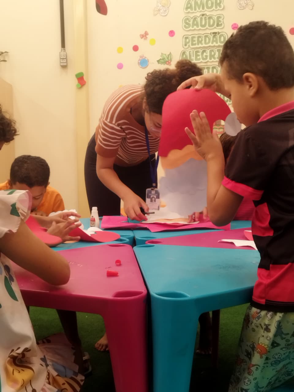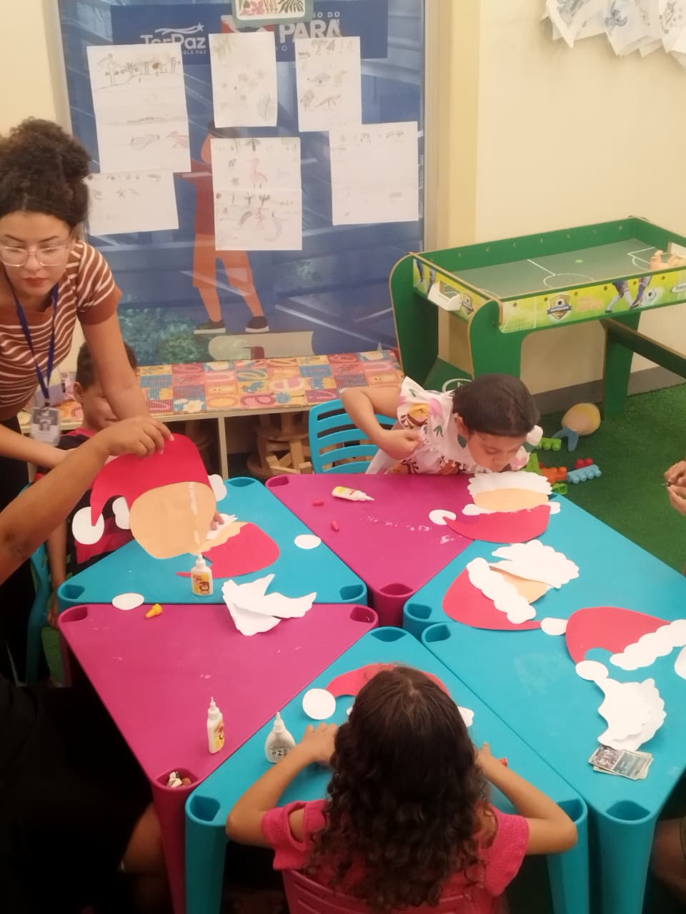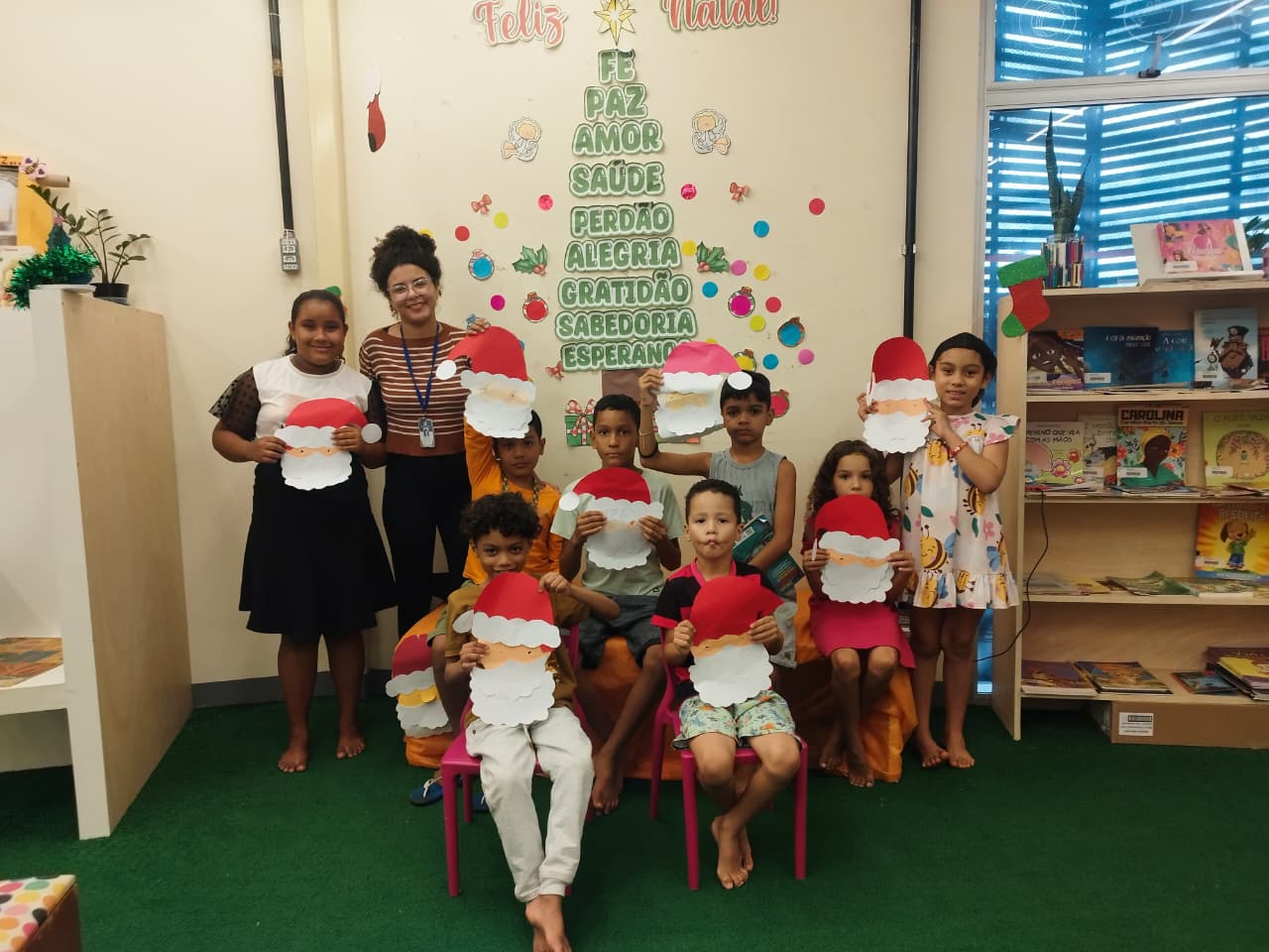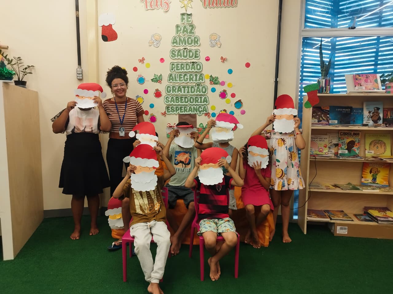 Durante a oficina, os participantes confeccionaram máscaras temáticas inspiradas no Papai Noel, utilizando materiais variados e explorando cores, texturas e elementos decorativos. A proposta incentivou a criatividade, a coordenação motora e a expressão artística, além de promover momentos de interação e cooperação entre as crianças.