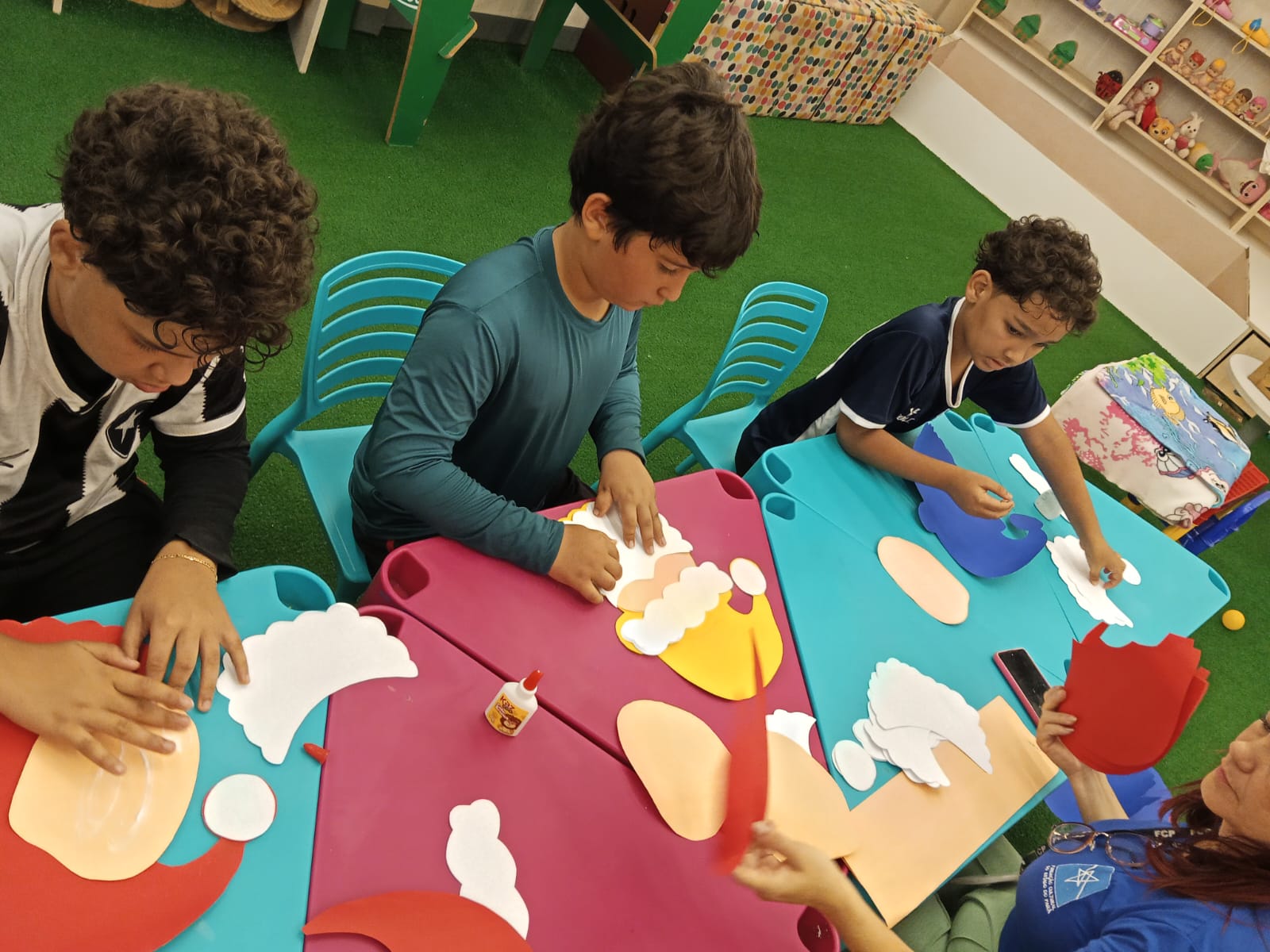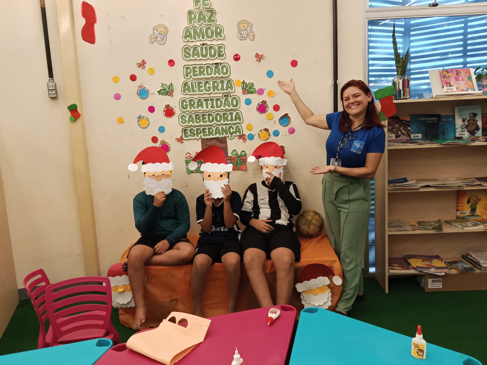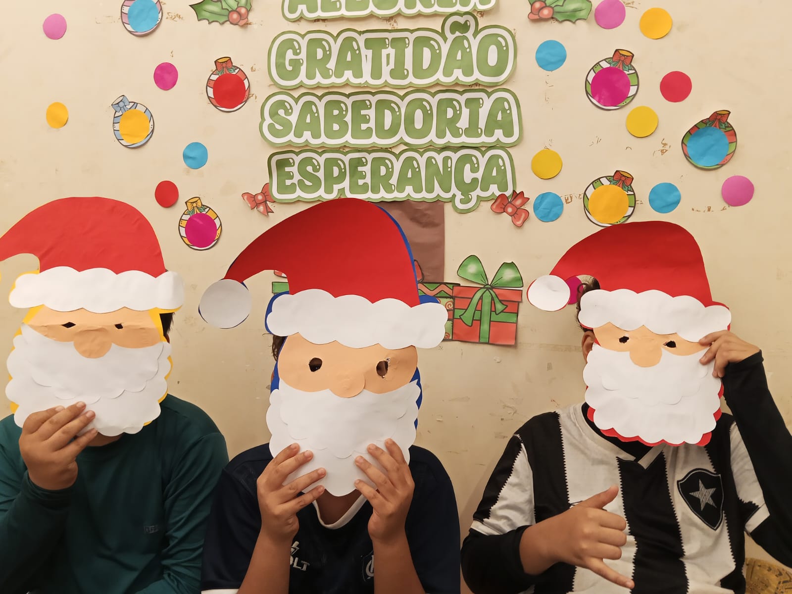 Durante a oficina, os participantes confeccionaram máscaras temáticas inspiradas no Papai Noel, utilizando materiais variados e explorando cores, texturas e elementos decorativos. A proposta incentivou a criatividade, a coordenação motora e a expressão artística, além de promover momentos de interação e cooperação entre as crianças.