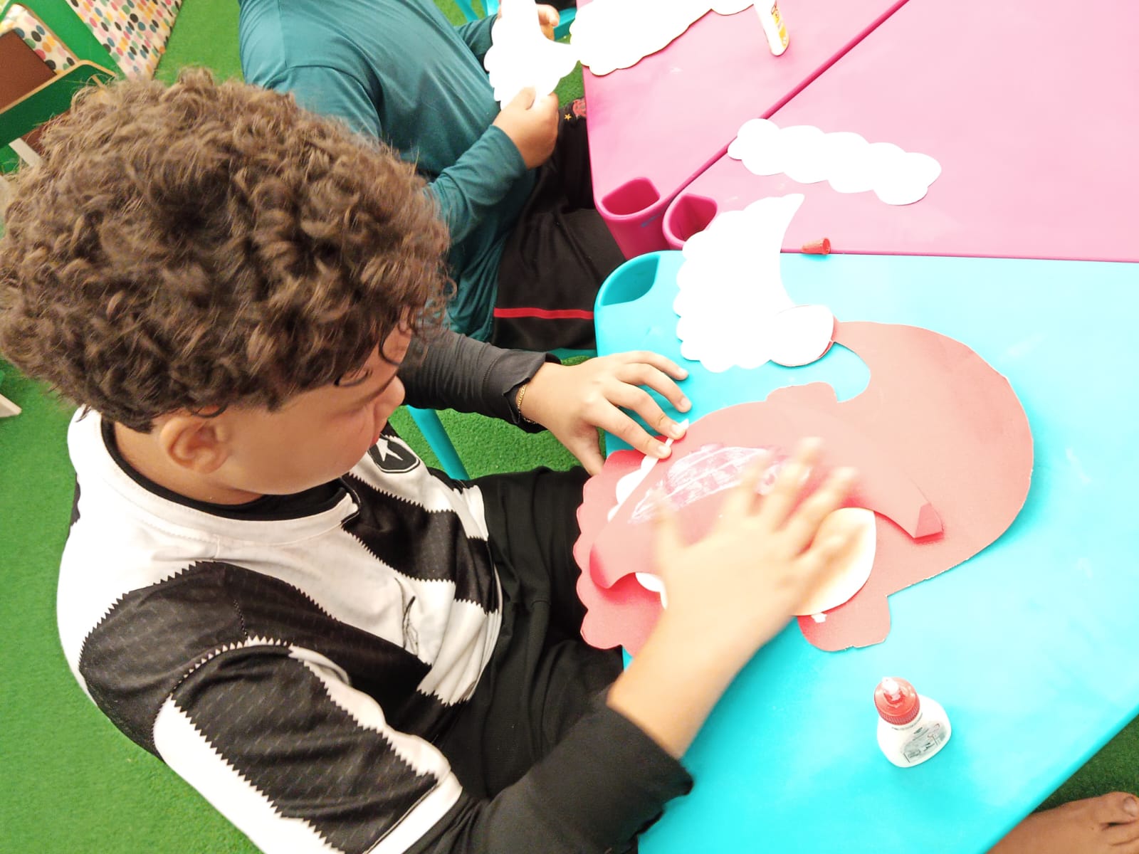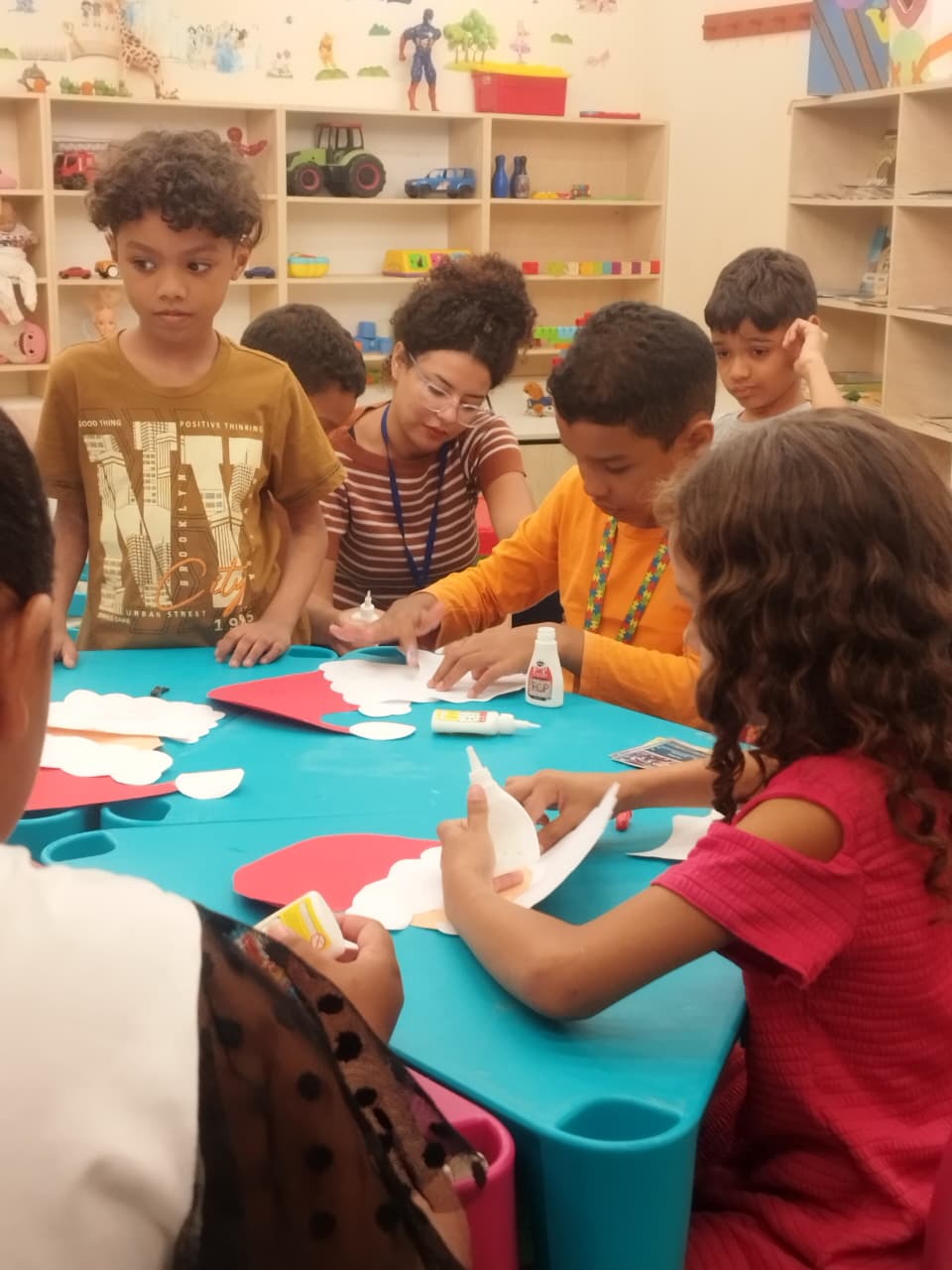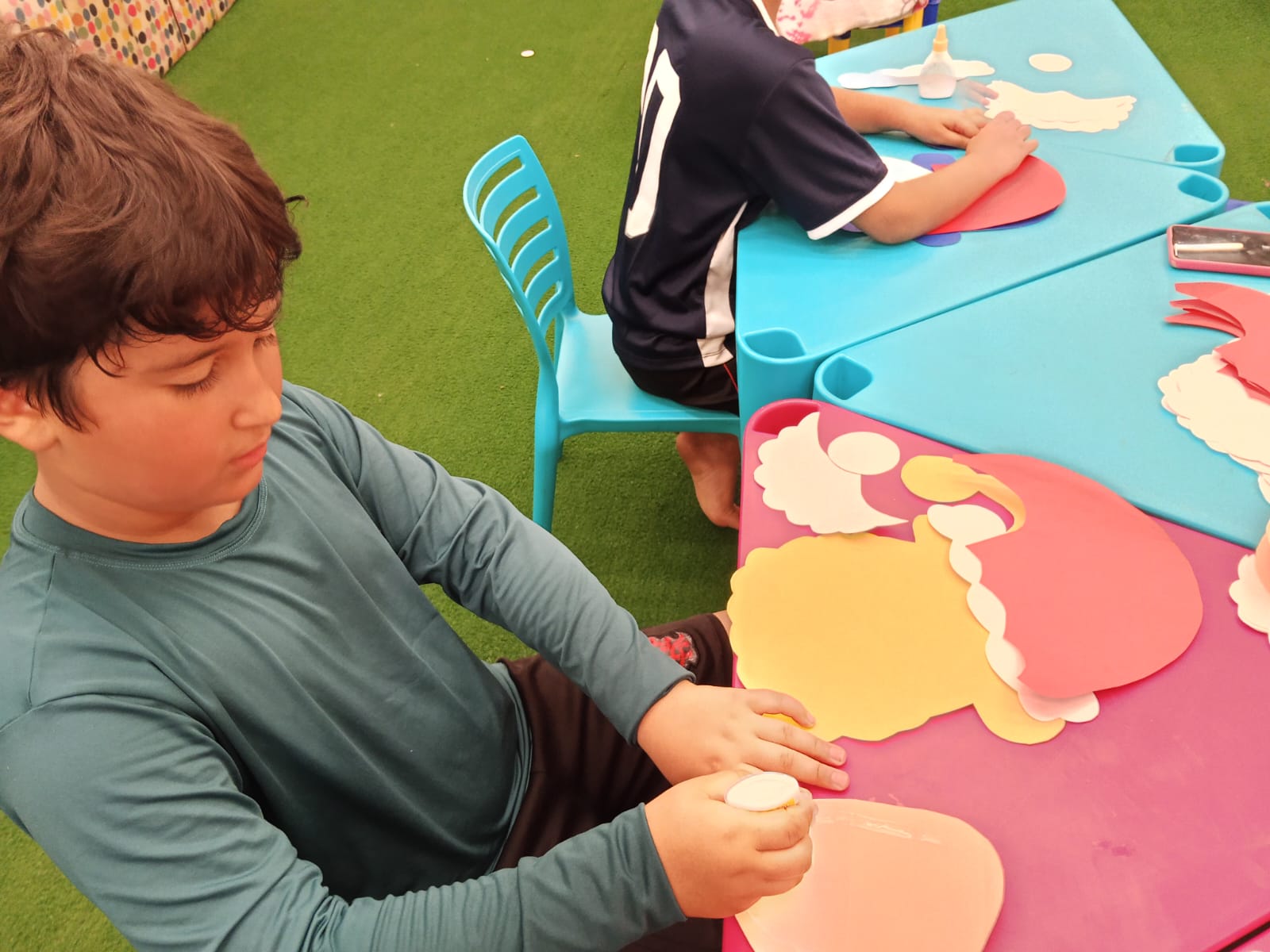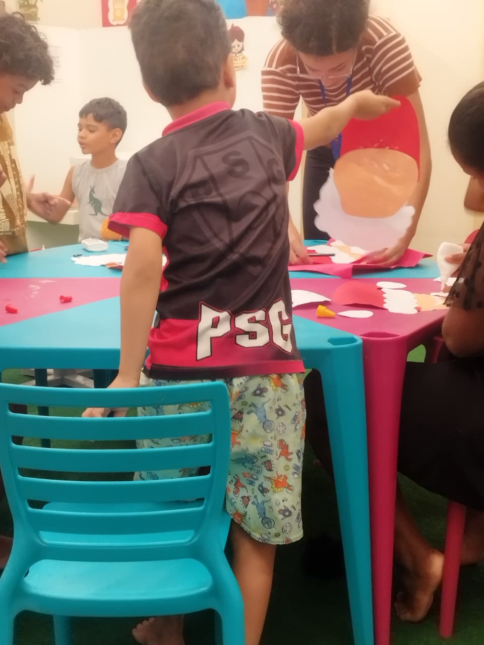 Durante a oficina, os participantes confeccionaram máscaras temáticas inspiradas no Papai Noel, utilizando materiais variados e explorando cores, texturas e elementos decorativos. A proposta incentivou a criatividade, a coordenação motora e a expressão artística, além de promover momentos de interação e cooperação entre as crianças.