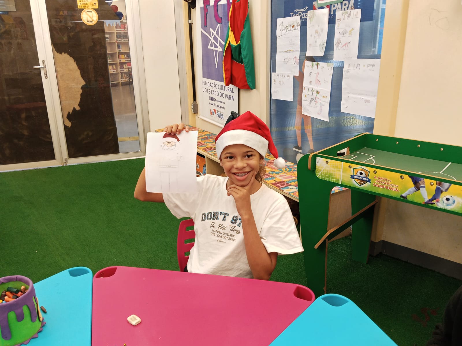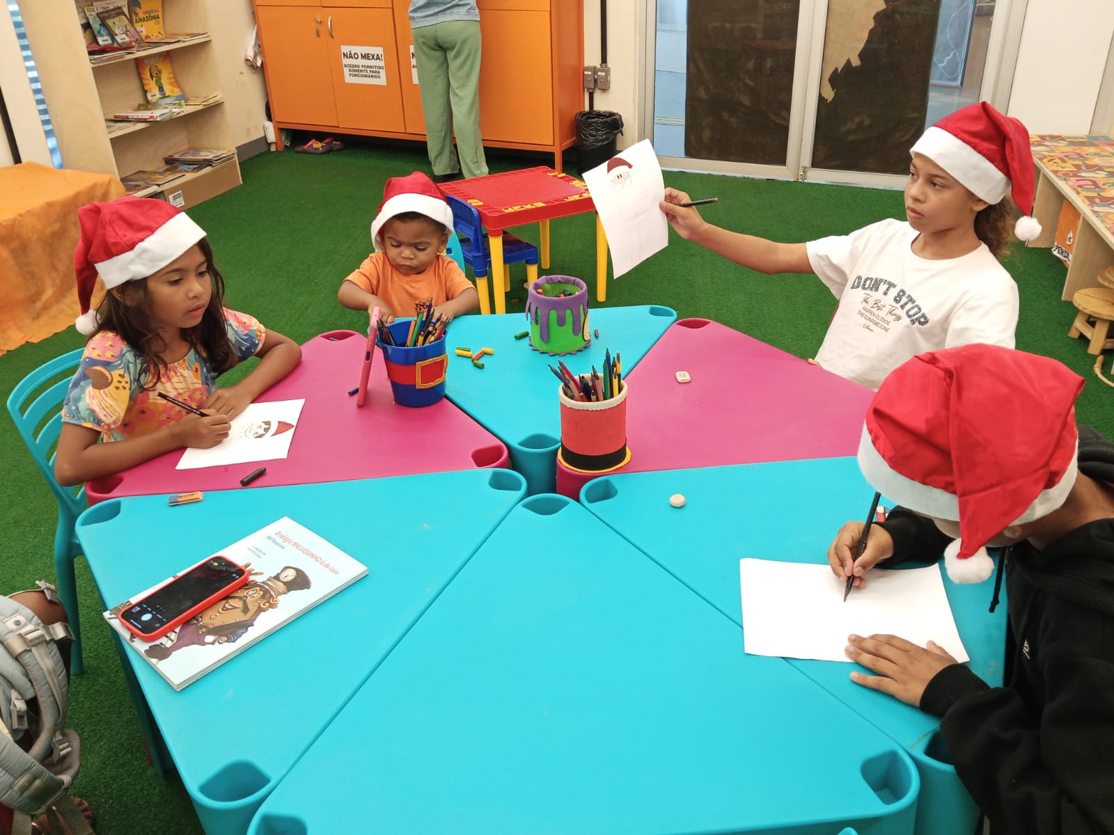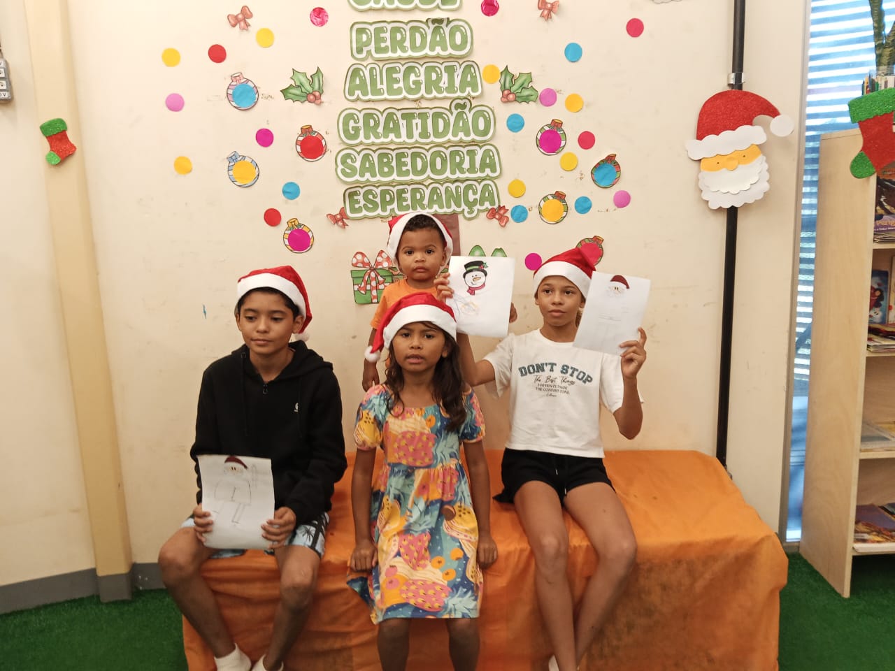 Pela manhã, as crianças participaram de uma oficina de pintura com giz de cera, tendo como tema o Papai Noel. A atividade estimulou a imaginação, a coordenação motora e a expressão artística, permitindo que cada participante colorisse e personalizasse seu desenho de maneira livre e criativa.