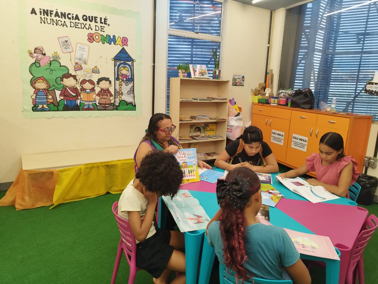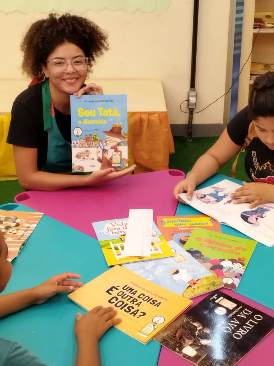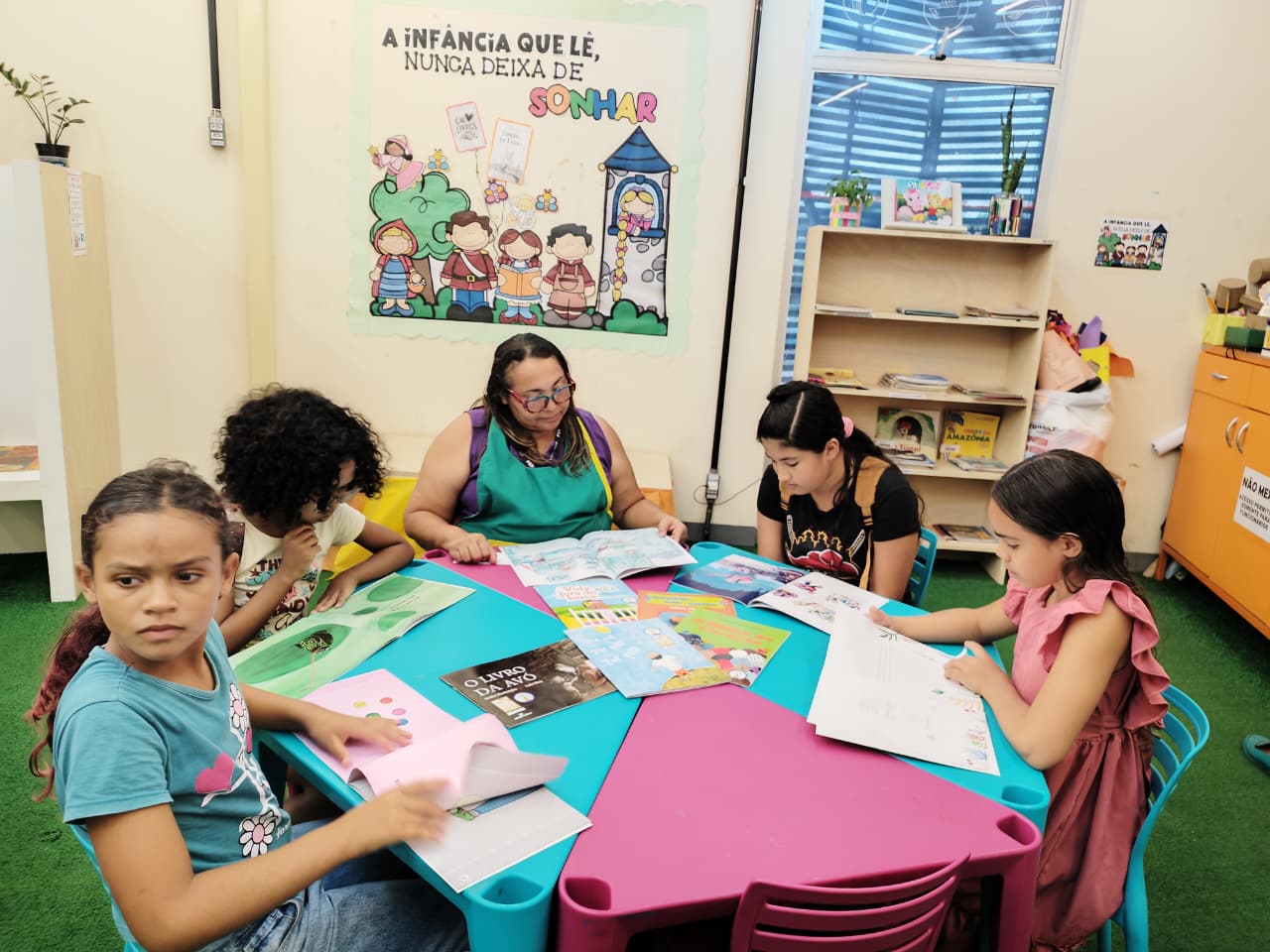 Os participantes tiveram a oportunidade de conhecer as novas obras, explorar capas, títulos e ilustrações, além de ouvir trechos selecionados pela equipe mediadora. O momento favoreceu a interação, permitindo que cada criança compartilhasse impressões, escolhesse livros de seu interesse e participasse da leitura coletiva.