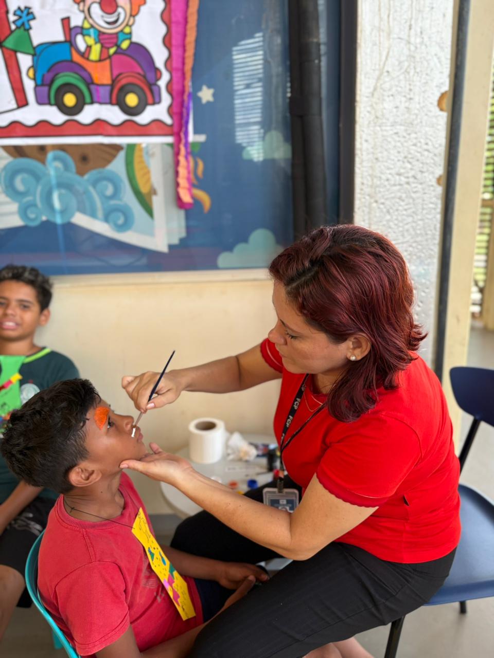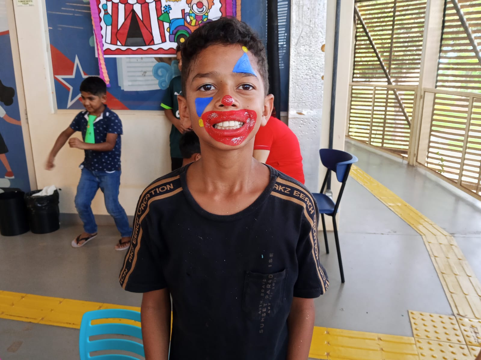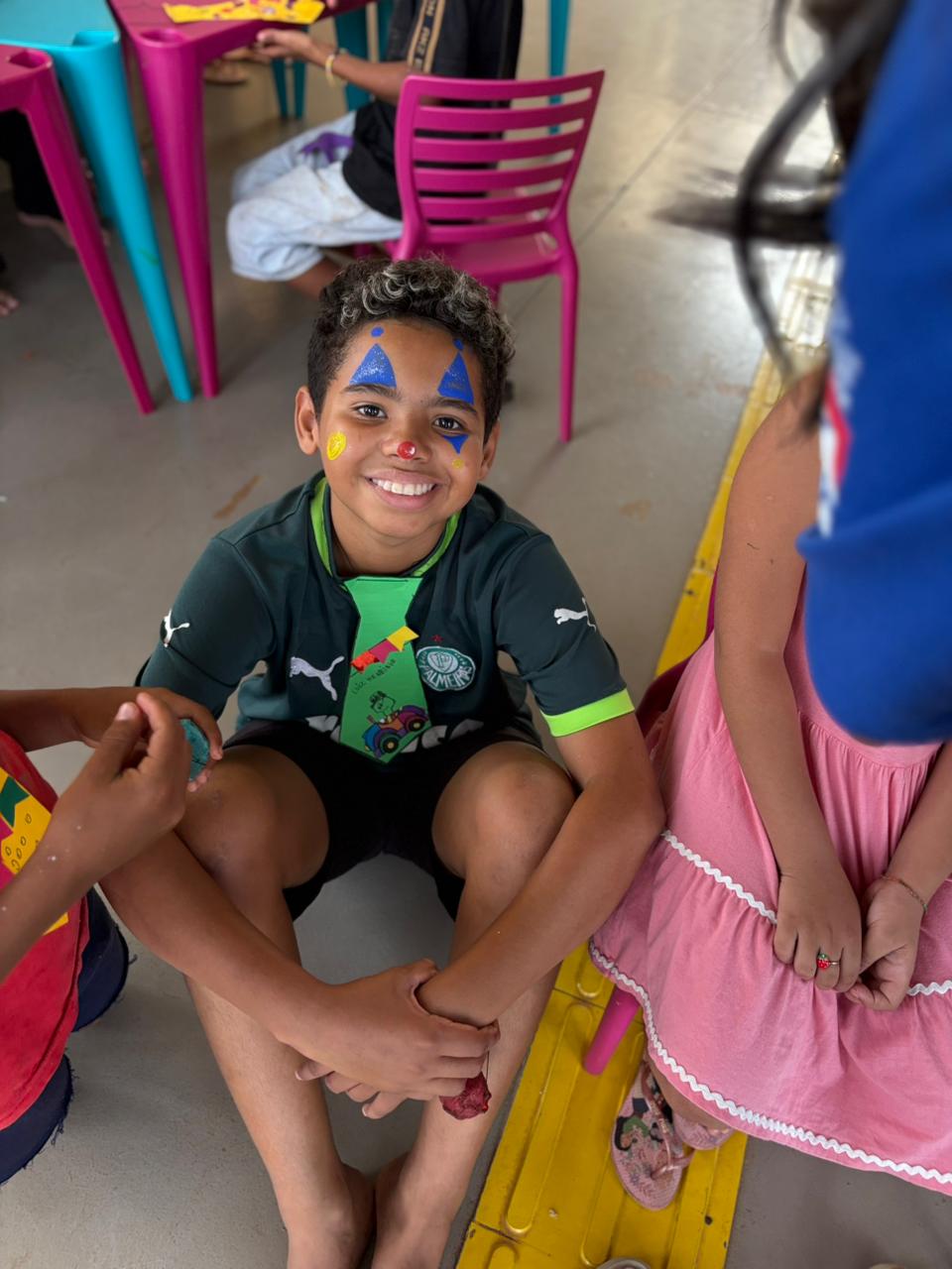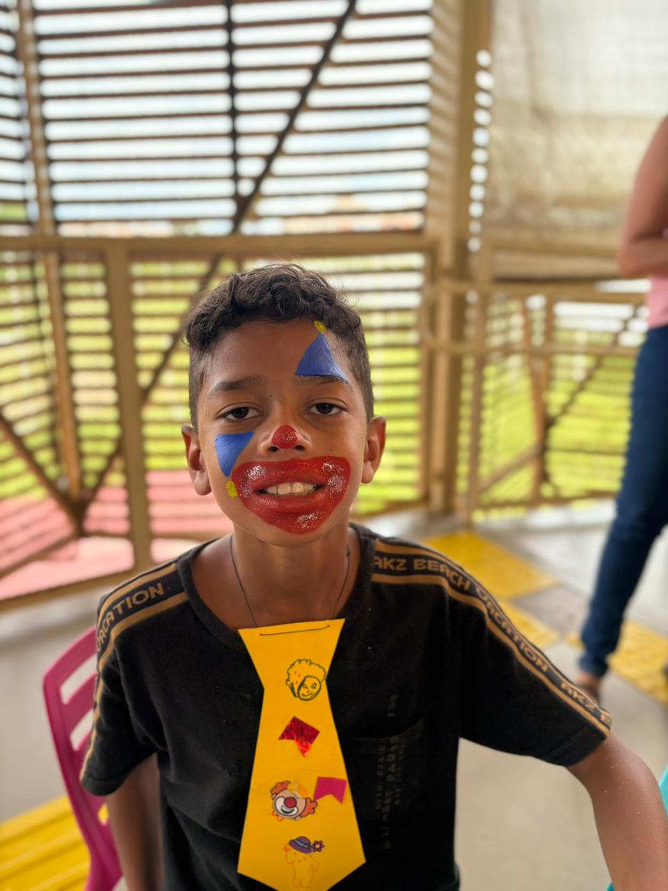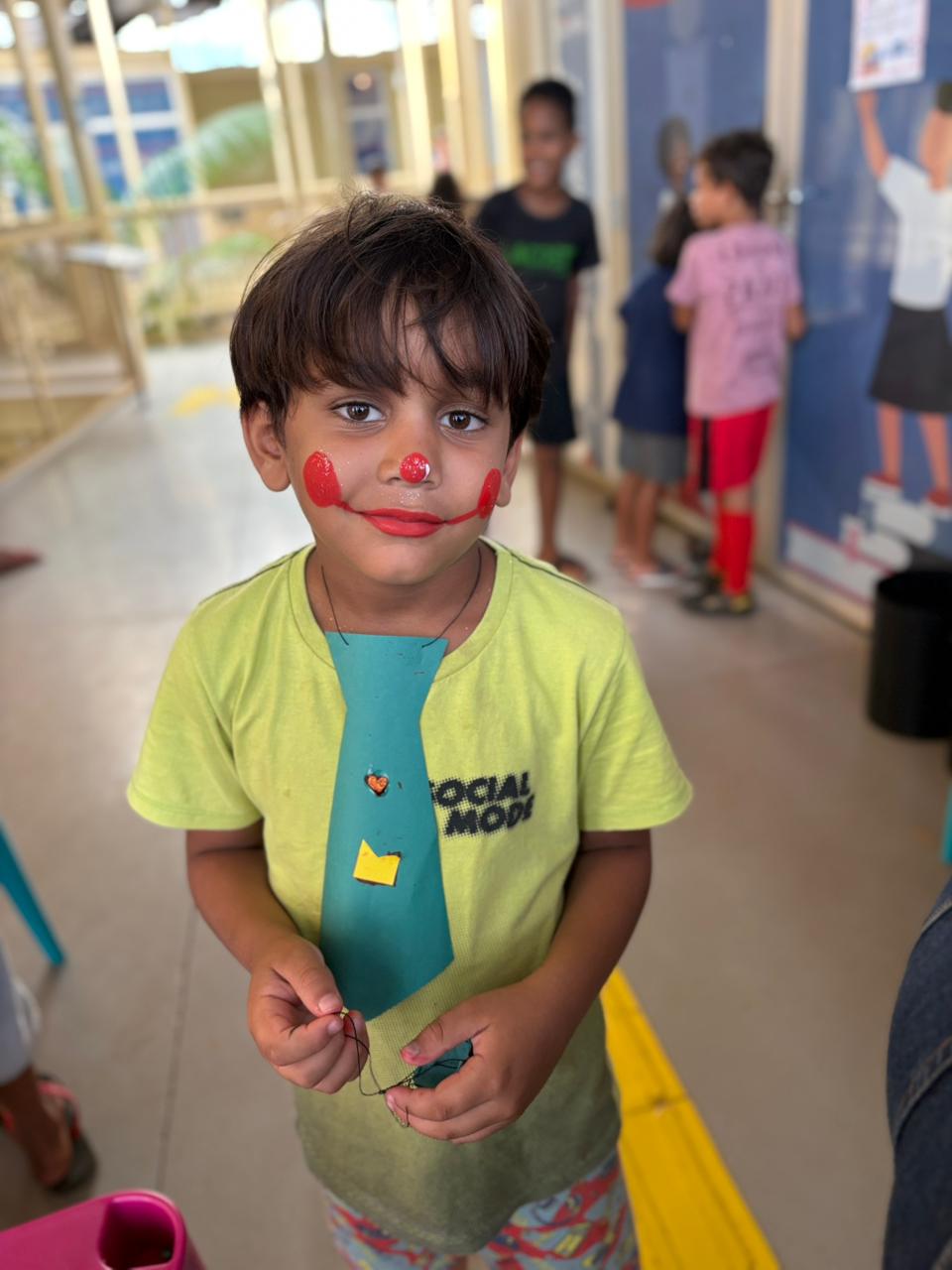 Durante a programação, as crianças participaram da confecção de nariz de palhaço e gravata divertida, estimulando a criatividade e o envolvimento com o universo circense. Em seguida, houve um momento de pintura facial, no qual os participantes se transformaram em alegres palhacinhos, tornando a atividade ainda mais interativa e envolvente.