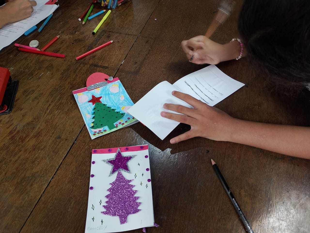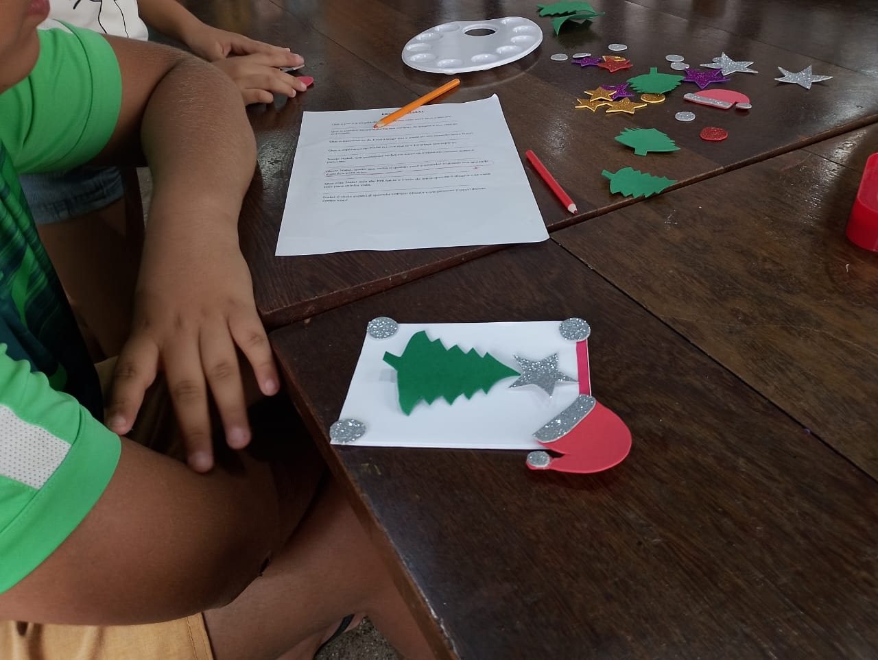 Durante a atividade, as crianças puderam confeccionar à mão seus próprios Cartão de Natal, utilizando diversos materiais coloridos e expressando grande criatividade e arte. Além disso, praticaram a escrita ao elaborar mensagens personalizadas e de afeto para os destinatário do cartões.