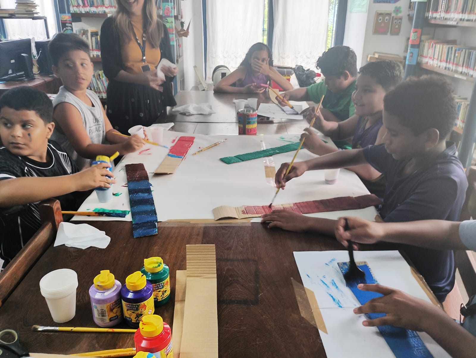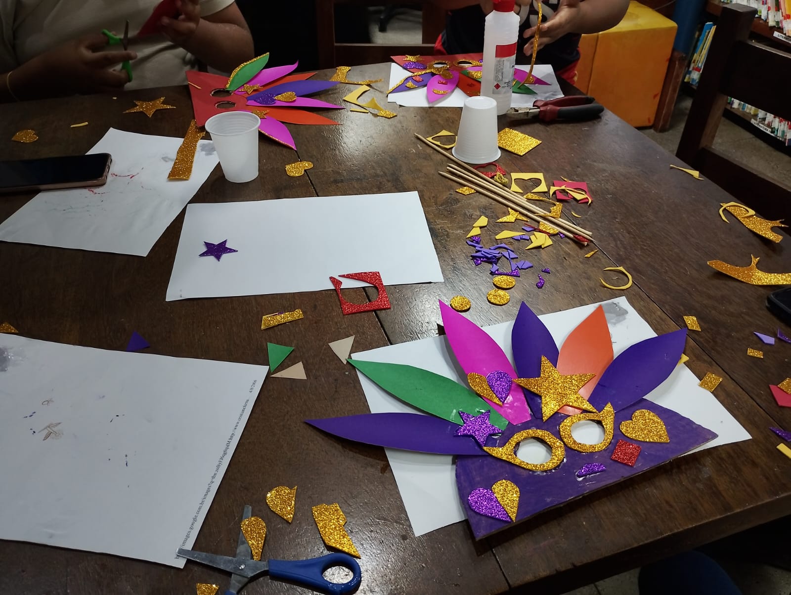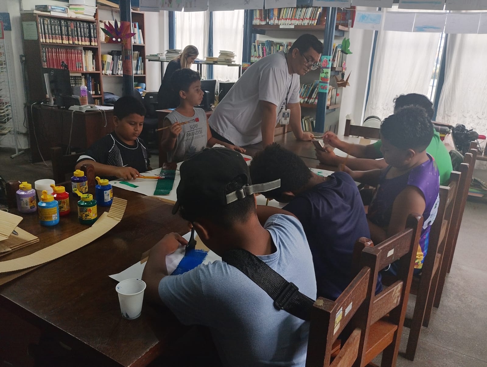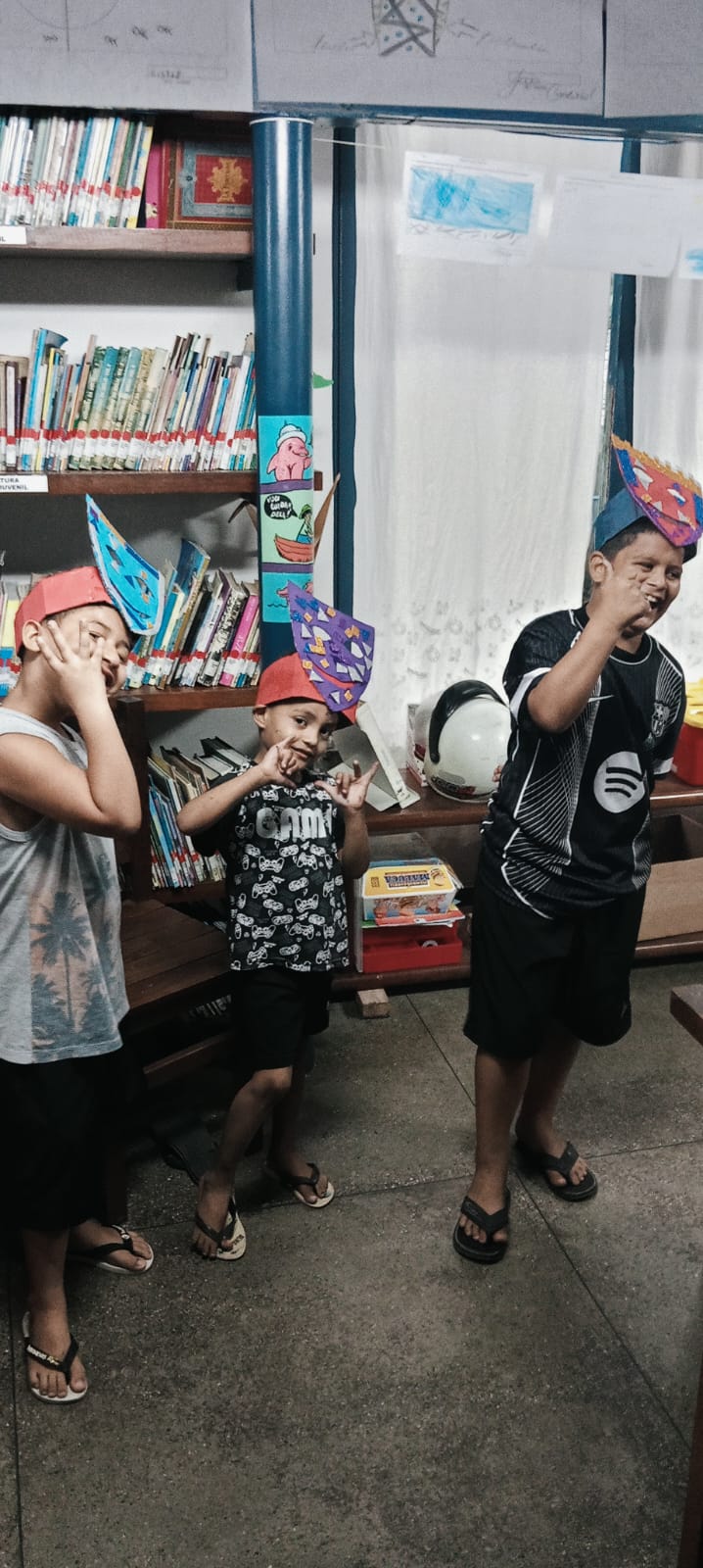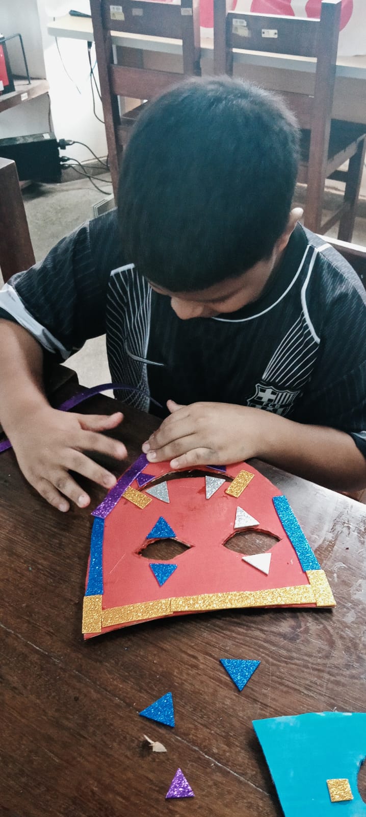 A atividade buscou proporcionar um ambiente lúdico e colaborativo entre os pequenos, utilizando materiais recicláveis, papel cartão, glitter e diversas tintas, tornando o espaço da biblioteca colorido, alegre e festivo nesse período.