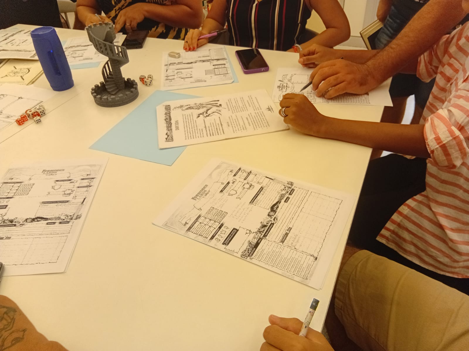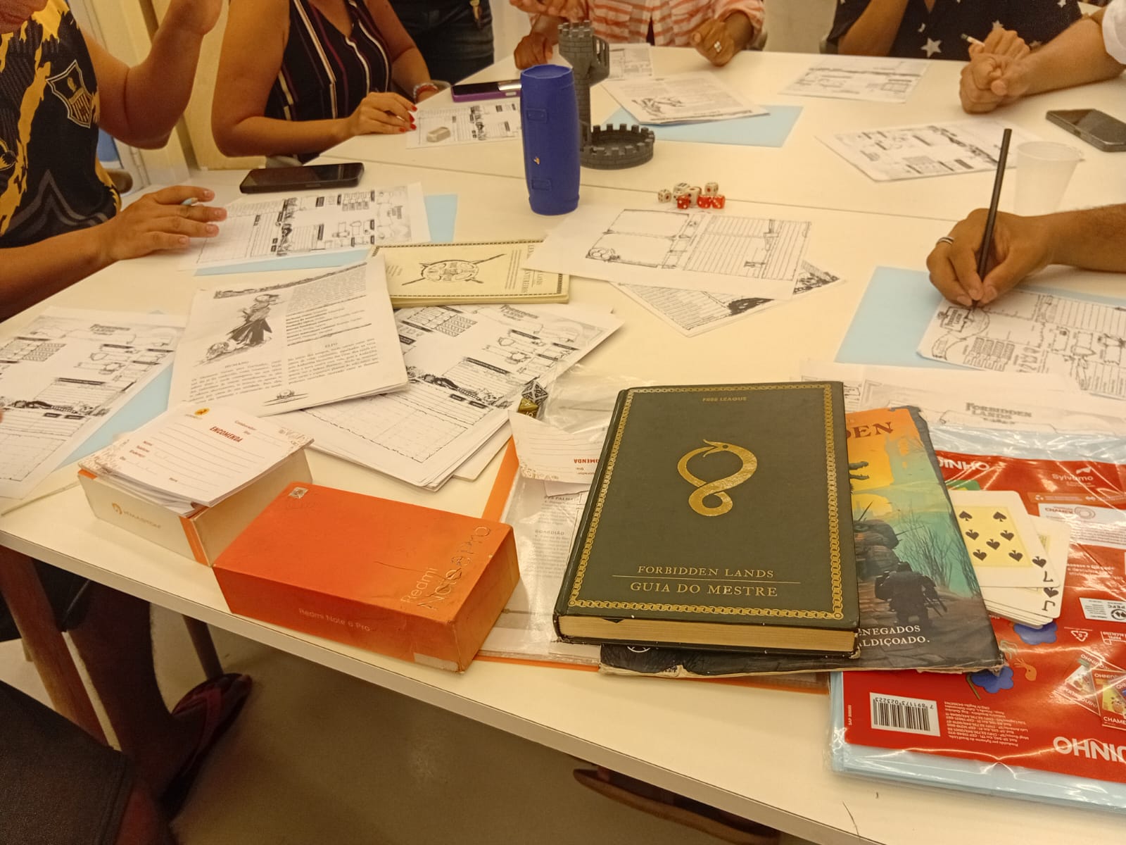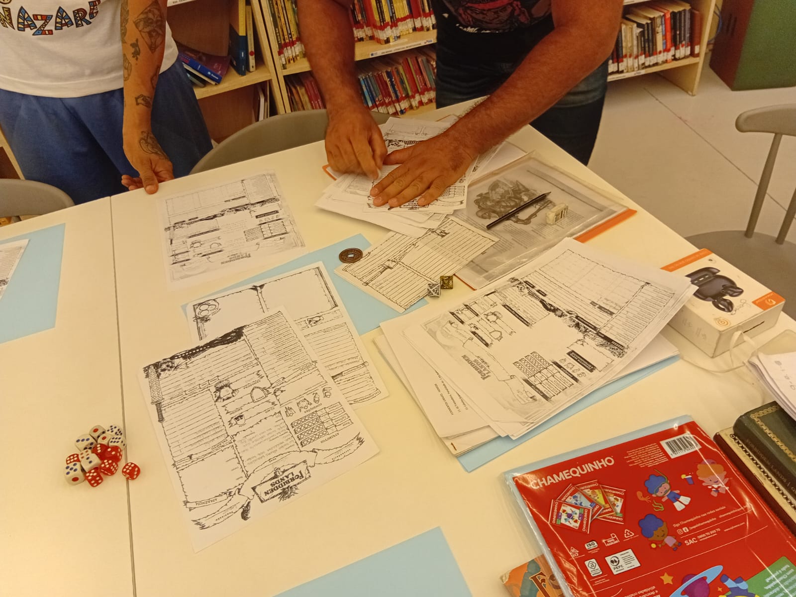 Durante a atividade, os participantes tiveram a oportunidade de conhecer a dinâmica do RPG 🎲 por meio da mesa Forbidden Lands, um jogo narrativo que incentiva o raciocínio lógico 🧠, o trabalho em equipe 🤝 e a construção coletiva de histórias 📝. A mediação permitiu que iniciantes e jogadores mais experientes participassem de forma acessível e colaborativa 😊.