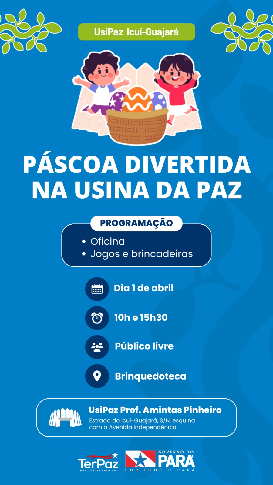 A biblioteca da Usina da Paz Icuí-Guajará foi palco de uma programação especial voltada ao público de todas as idades durante a atividade “Páscoa Divertida na Usina da Paz”, realizada no dia 1º de abril de 2026. Com atividades nos horários de 10h e 15h30, o evento reuniu participantes em um ambiente de integração, aprendizado e lazer.