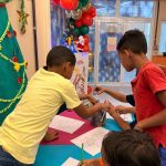 Entre as atividades, o mural de pintura natalina despertou a criatividade das crianças, que puderam expressar seus sentimentos e imaginar o Natal por meio de desenhos cheios de cores e significados. As brincadeiras garantiram animação do começo ao fim: na dinâmica do balão amarrado no pé, as crianças se divertiram tentando estourar o balão do colega; a tradicional brincadeira da cadeira trouxe muita empolgação; e a atividade “Coloque o Balão no Cesto” estimulou o trabalho em equipe, já que era realizada em dupla, com uma criança vendada e a outra orientando o caminho até o cesto.