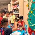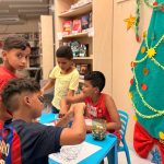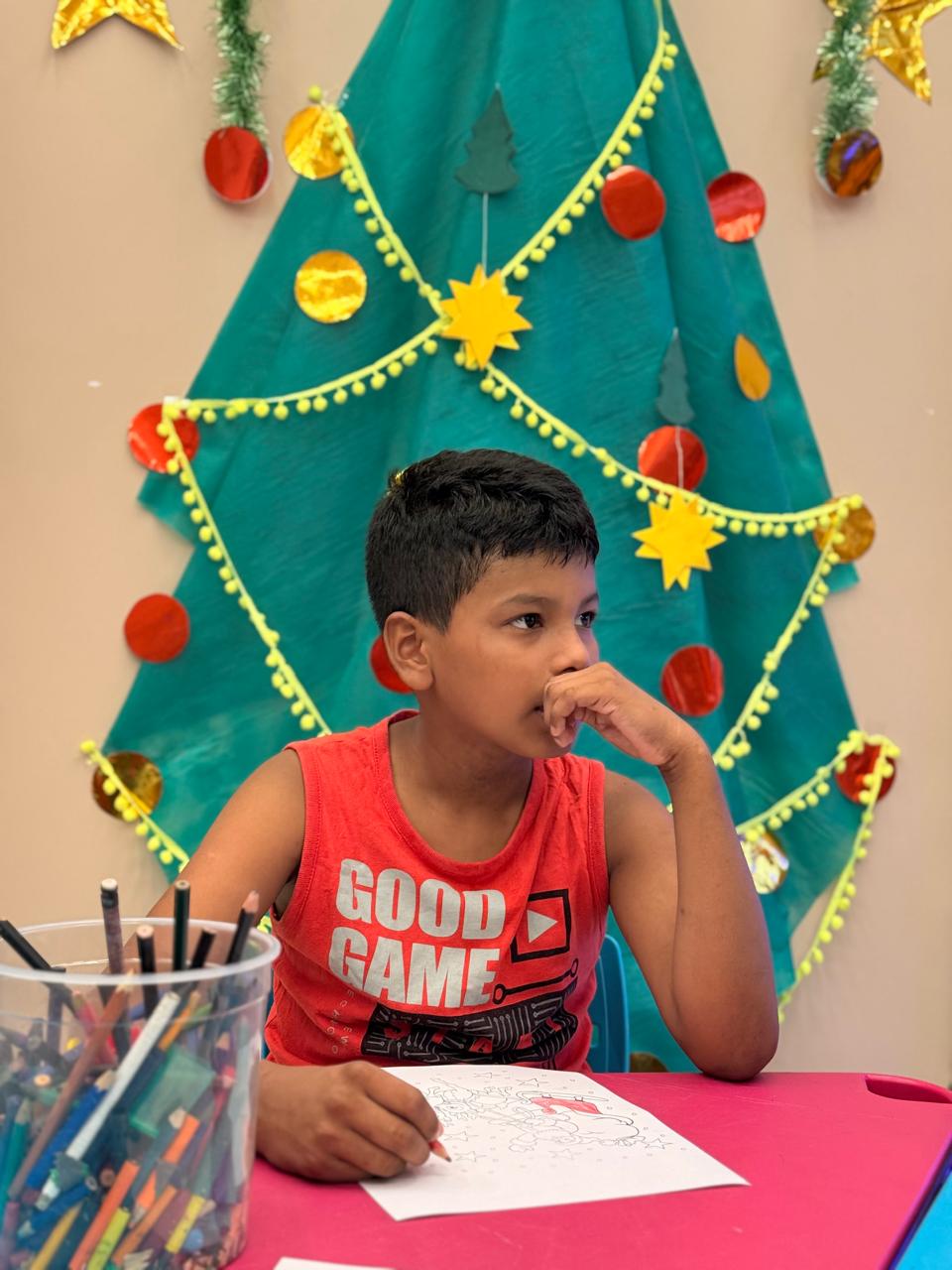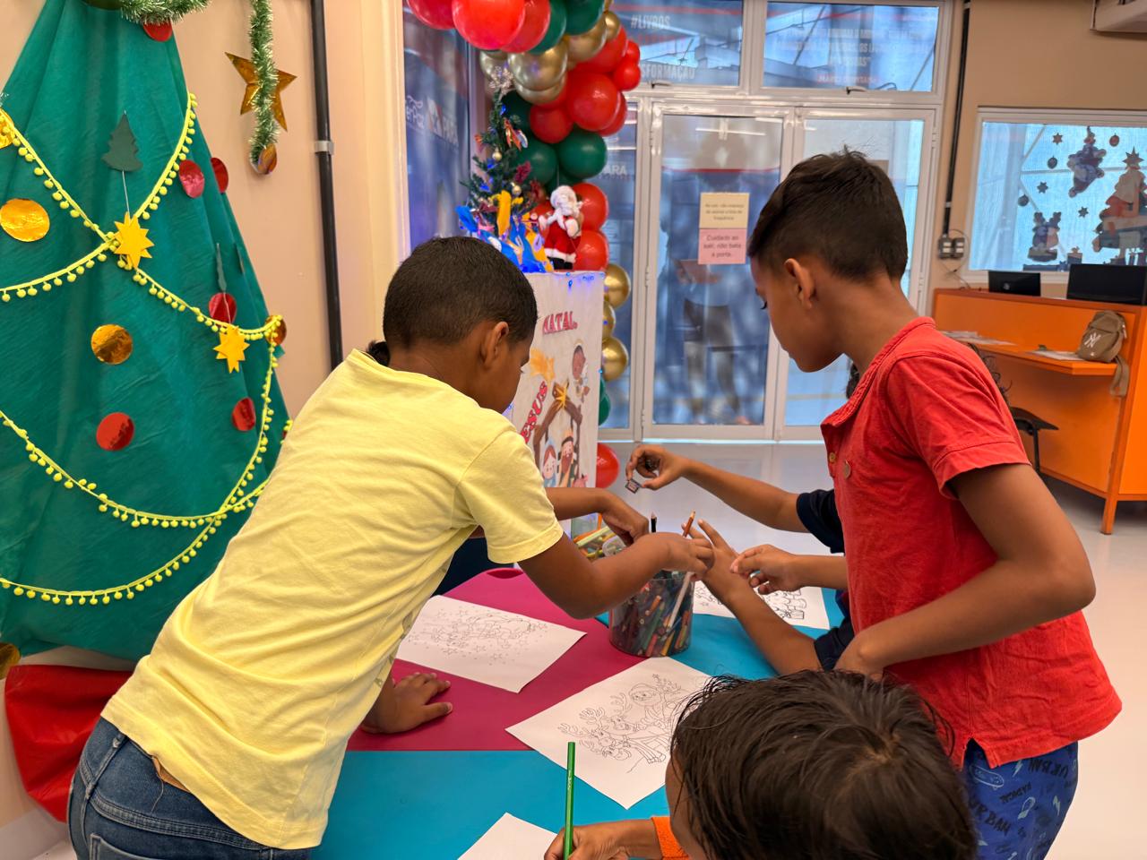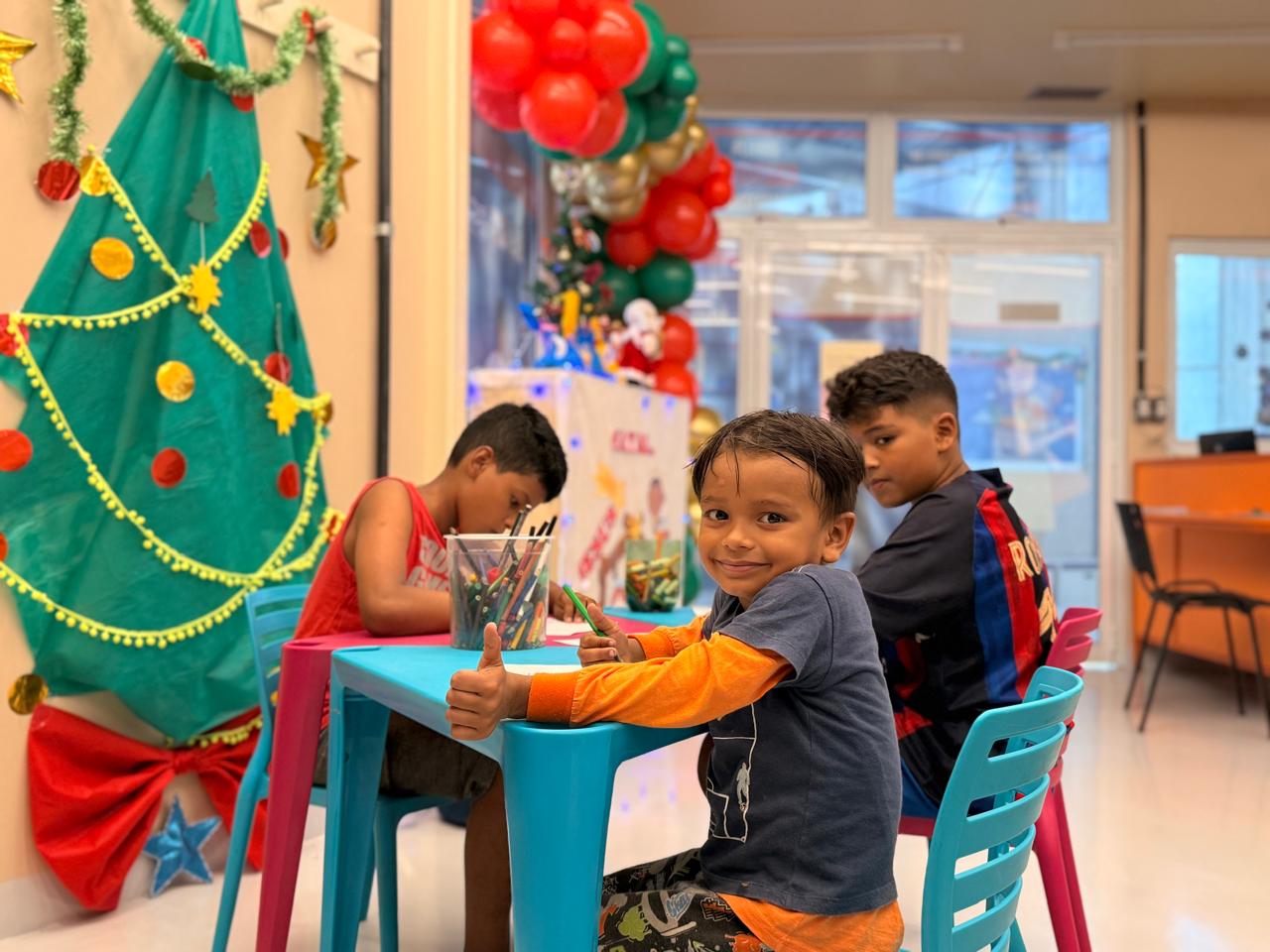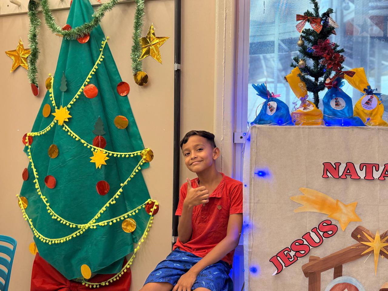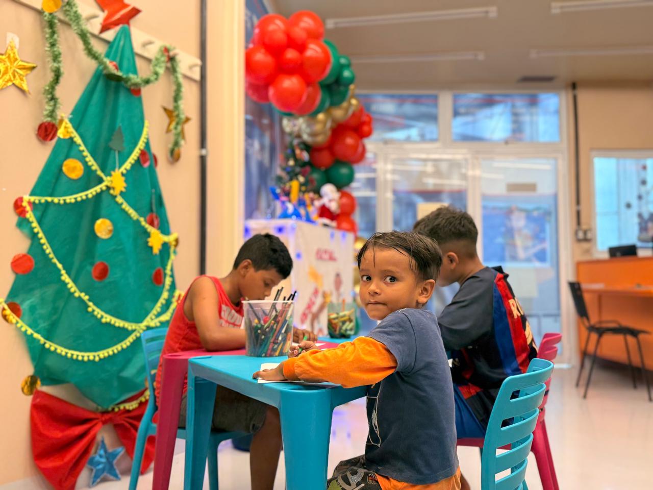 Entre as atividades, o mural de pintura natalina despertou a criatividade das crianças, que puderam expressar seus sentimentos e imaginar o Natal por meio de desenhos cheios de cores e significados. As brincadeiras garantiram animação do começo ao fim: na dinâmica do balão amarrado no pé, as crianças se divertiram tentando estourar o balão do colega; a tradicional brincadeira da cadeira trouxe muita empolgação; e a atividade “Coloque o Balão no Cesto” estimulou o trabalho em equipe, já que era realizada em dupla, com uma criança vendada e a outra orientando o caminho até o cesto.