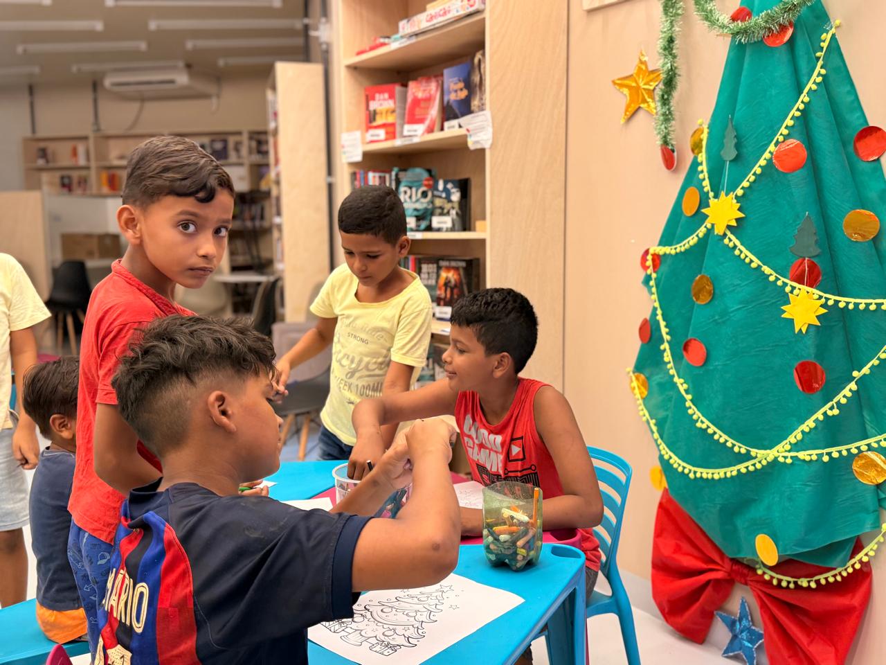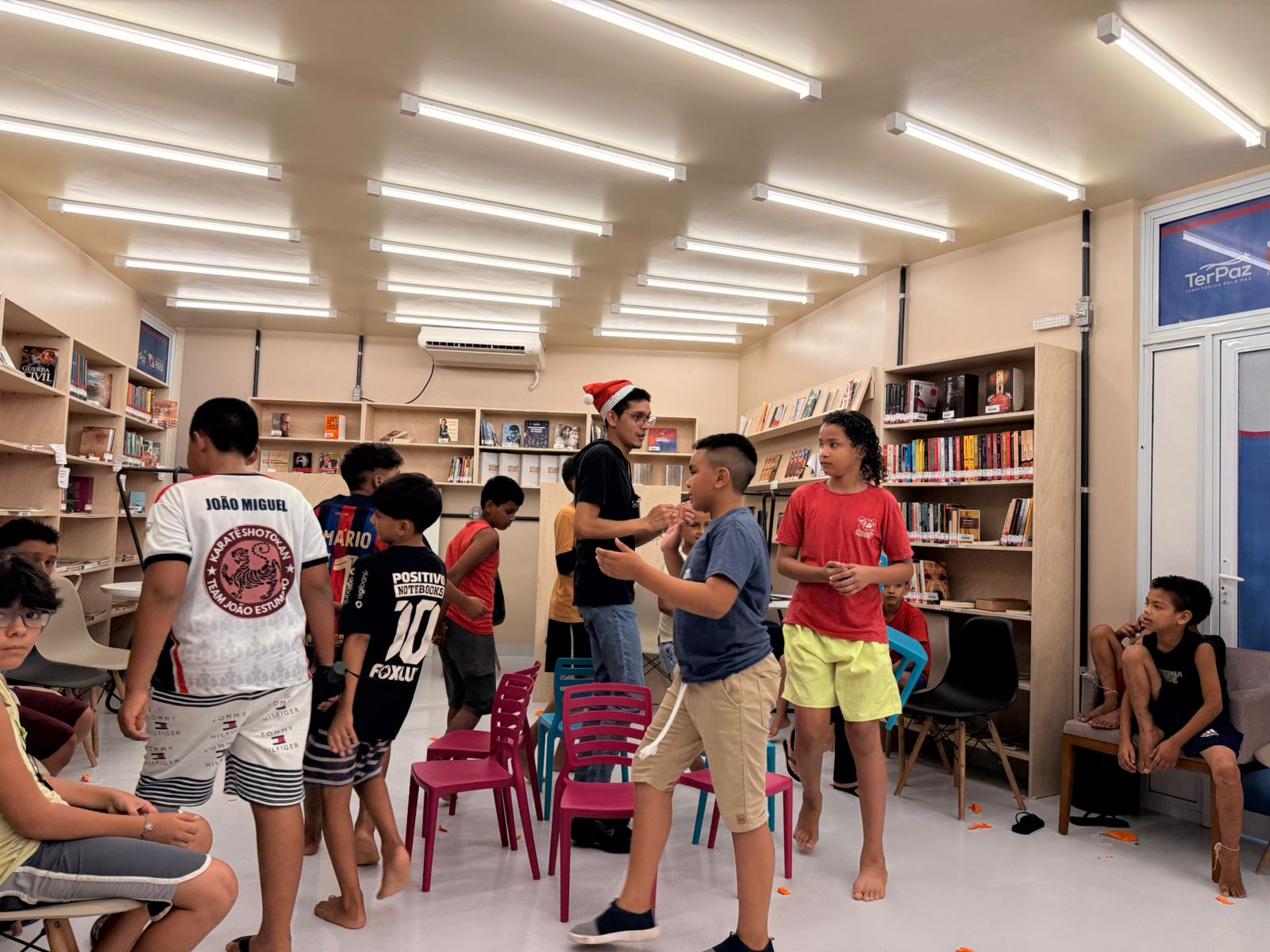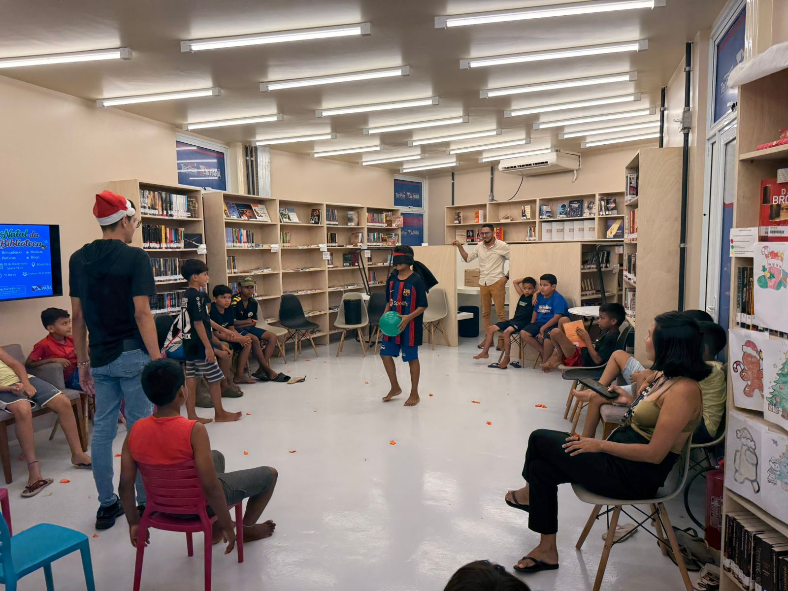 A biblioteca foi tomada pelo clima natalino em uma tarde especial repleta de cores, risadas e muita interação. A festa de Natal reuniu crianças e famílias em um momento de celebração, convivência e diversão, reforçando a biblioteca como um espaço de encontro e alegria para a comunidade.